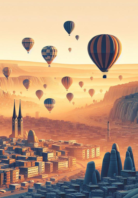 Tapete Heißluftballon | Überflug einer Stadt in den Bergen