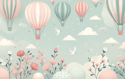 Tapete Heißluftballon | Rosa und weiße Blumen mit Möwen und Wolken Tapete