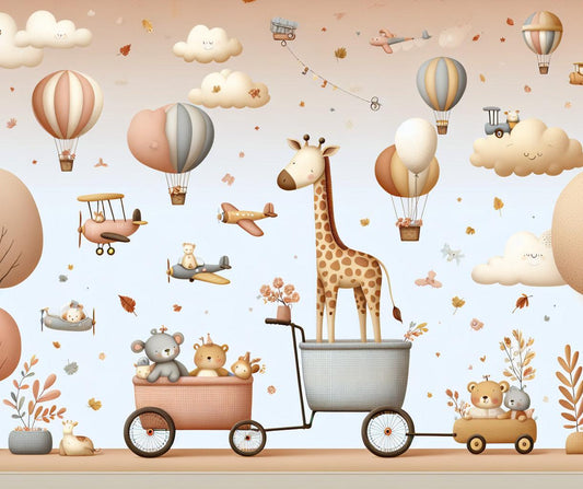 Tapete Heißluftballon | Tiere, Wolken und Savanne in neutralen Farbtönen