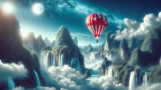Tapete Heißluftballon | Roter Sternenballon in majestätischen Wasserfällen