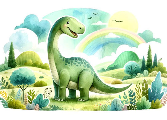 Kindertapete Dinosaurier| Aquarell eines grünen Diplodocus in einer Wiese