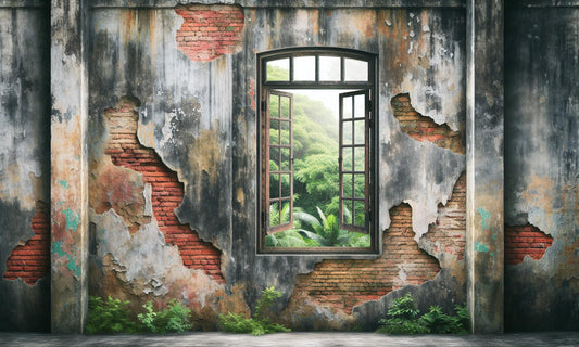 3D Tapete | Verfallene Wände und Fenster mit Blick auf einen tropischen Wald