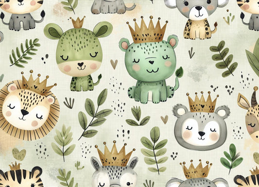 Tapete Kinderzimmer | Tiere der Savanne mit Kronen und Blättern