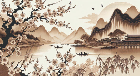 Japanische Tapete | Sakura und ruhiger See in Beigetönen