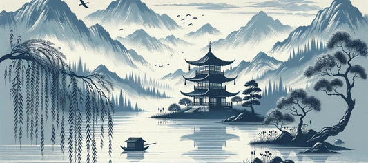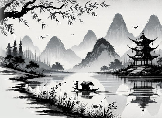 Japanische Tapete | Schwarz-weißes Gemälde eines Tempels im GebirgeNormaler Preis 29,90€/m²Verkaufspreis 29,90€ Normaler PreisGrundpreis pro