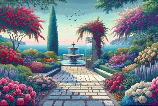 3D Tapete | Brunnen und Zypressen im blühenden Garten