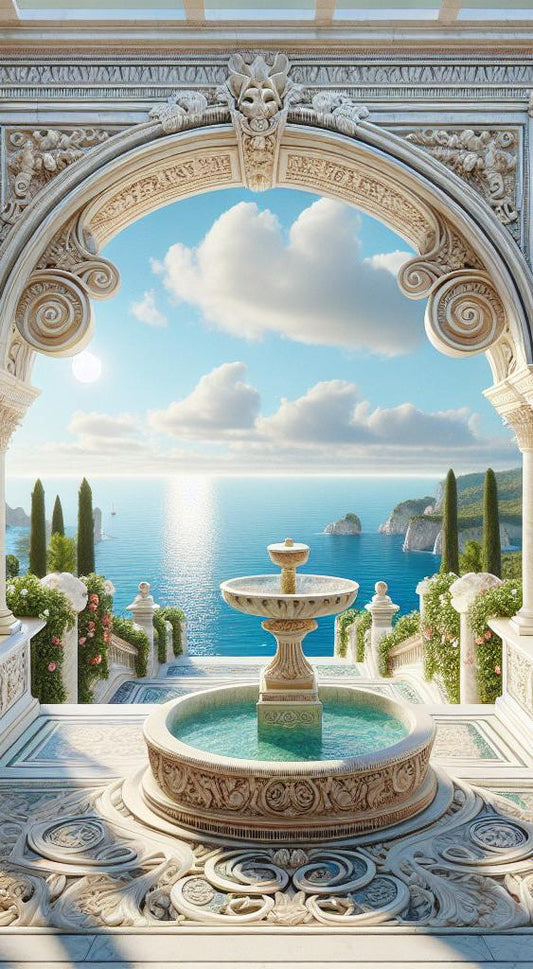 3D Tapete | Majestätischer Brunnen in antikem Ambiente mit Blick auf das Mittelmeer