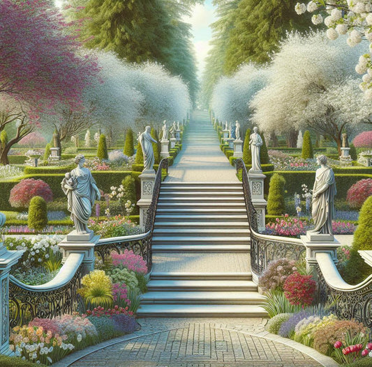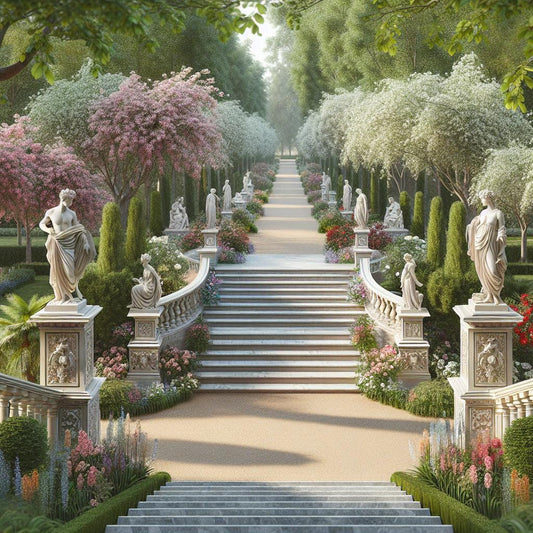 3D Tapete | Allee in einem blühenden Garten mit antiken Statuen