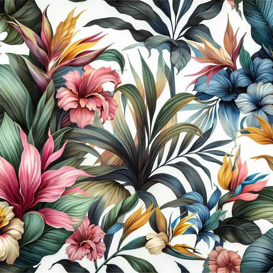 Pastellfarbenes Blumenmuster-Tapete | Bunte tropische Blumen auf weißem Hintergrund-Tapete