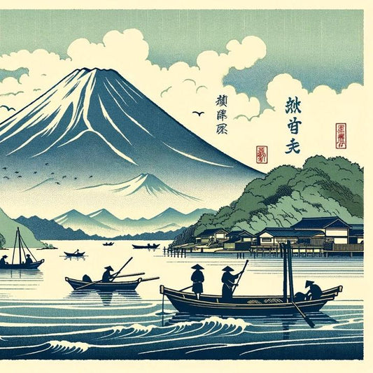 Japanische Tapete | Fuji-Berg und japanischer See mit Booten