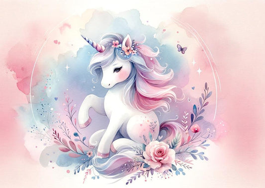 Einhorn Tapete | Aquarell Blumen und kleine Einhorn