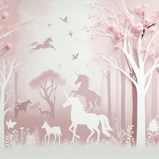 Einhorn Tapete | Weiße Einhorn Silhouetten in einem Wald in Rosa-Tönen
