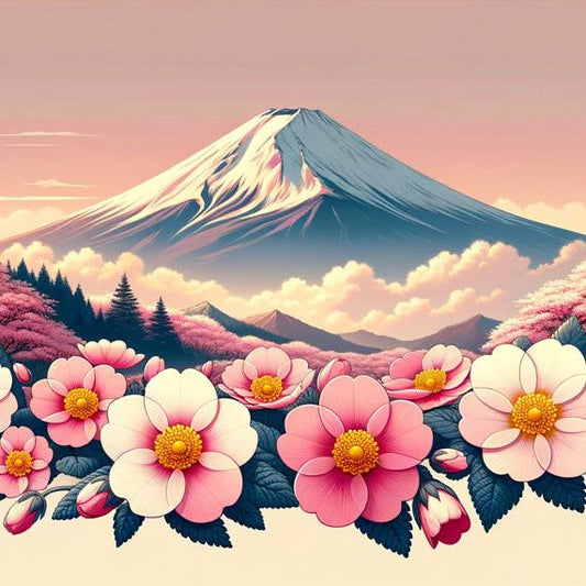 Japanische Blumen Tapete | Rosa Blumen und Mont Fuji Tapete