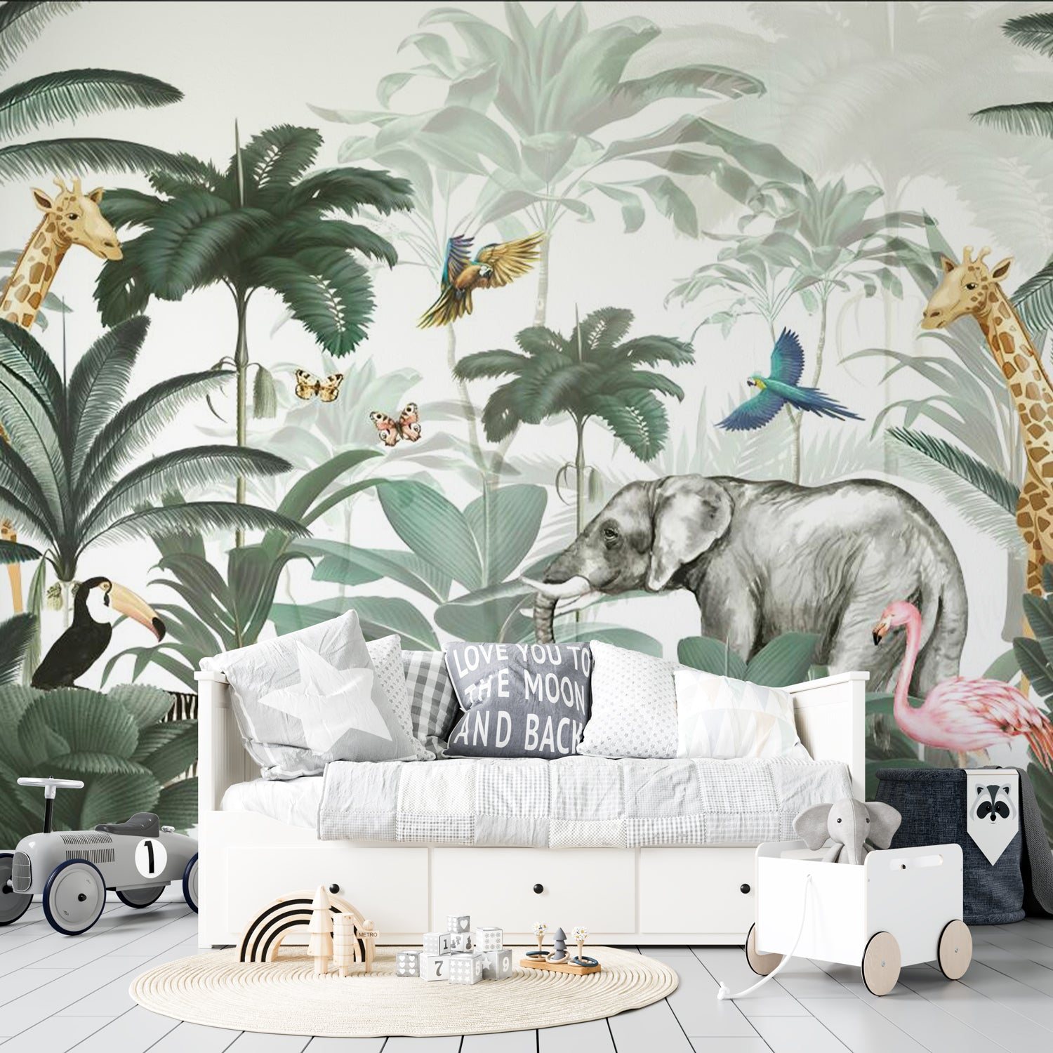 Tauchen Sie das Kinderzimmer Ihres Kindes in ein Abenteuer mitten in einem speziell für Kinder erschaffenen Dschungel ein mit dieser Tapete mit kindlichem Design. Stellen Sie sich eine Landschaft vor, in der zwei freundliche Giraffen, ein majestätisches Elefanten, ein elegantes Zebra, ein strahlender Tukan, flatternde Schmetterlinge und fliegende Papageien das Panorama schmücken, alles im Schatten prächtiger Palmen. Perfekt für diejenigen, die eine Traum- und Erkundungsdimension in das Zimmer ihres Nachwuchses bringen möchten, ist diese Tapete ein Ode an die Neugier und Fantasie. Machen Sie ihren Raum zu einem Heiligtum voller Abenteuer und unendlicher Träume!