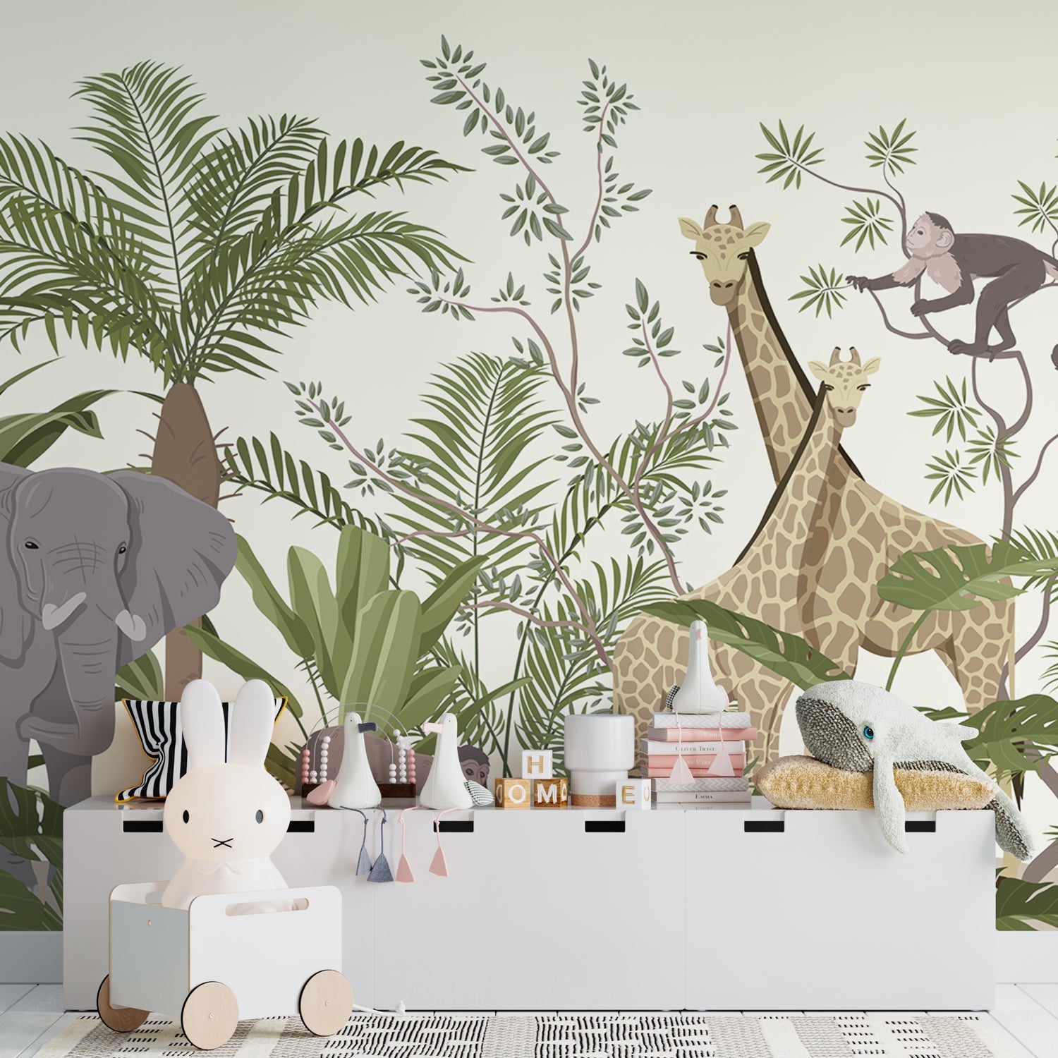 Verwandeln Sie das Zimmer Ihres Kindes in ein außergewöhnliches Abenteuer im Herzen eines speziell für Kinder entworfenen Dschungels mit dieser zauberhaften Tapete. Stellen Sie sich eine Landschaft vor, in der ein freundliches Giraffenpaar, ein majestätisches Elefanten, ein elegantes Zebra, ein blendender Tukan, schwirrende Schmetterlinge und fliegende Papageien die Aussicht verschönern, alles unter dem wohlwollenden Schatten exotischer Palmen und anderer üppiger Pflanzen. Geben Sie Ihrem Kind ein Zimmer, in dem Abenteuer und Magie herrschen!