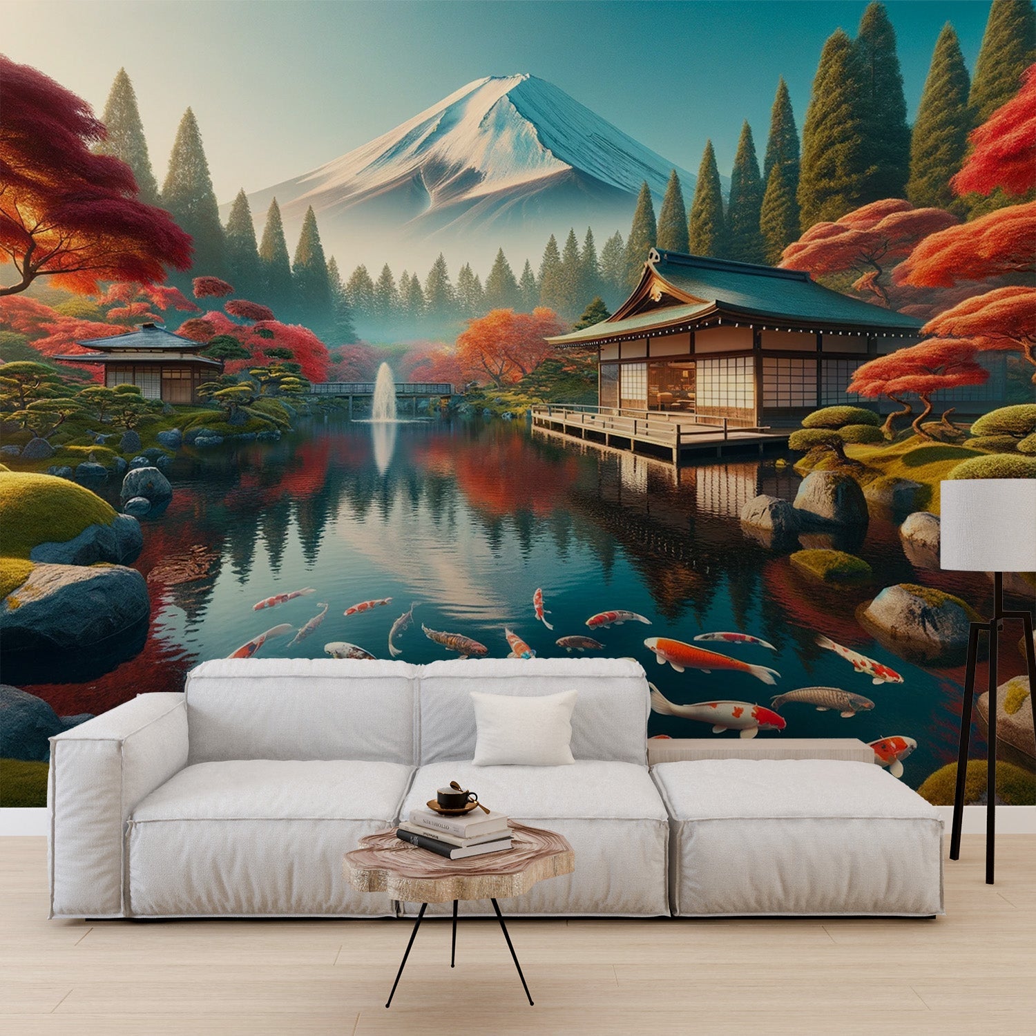 Dieses Japanische Tapete ist eine lebendige Feier der japanischen Natur und bietet einen spektakulären Blick auf den majestätischen und beruhigenden Mount Fuji. Die Szene wird in sanftes Licht getaucht, das die warme Farbpalette der Bäume und der friedlich schwimmenden Koi-Karpfen im Teich hervorhebt. Die traditionelle Architektur spiegelt sich im ruhigen Wasser wider und trägt zur meditativen Atmosphäre dieser Landschaft bei.