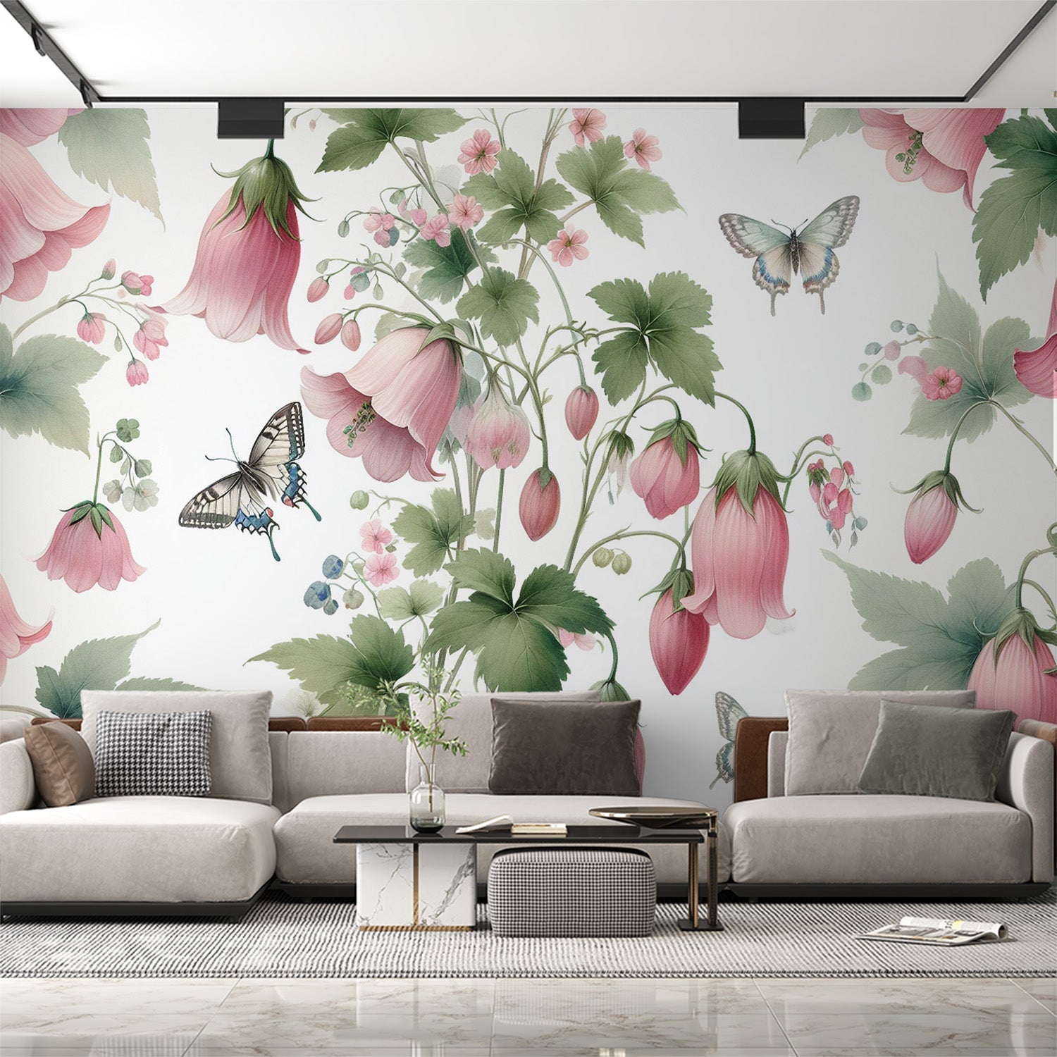 Dieses Blumige Tapete ist eine Ode an die Zartheit der Natur, mit ihren zartrosa Glöckchen, die sanft an dünnen Stielen hängen und im imaginären Wind tanzen. Die subtile Anwesenheit von Schmetterlingen auf dieser Pastellblumigen Tapete fügt eine Note von Leichtigkeit und Anmut hinzu, die an die verzauberten Gärten der Märchen erinnert.