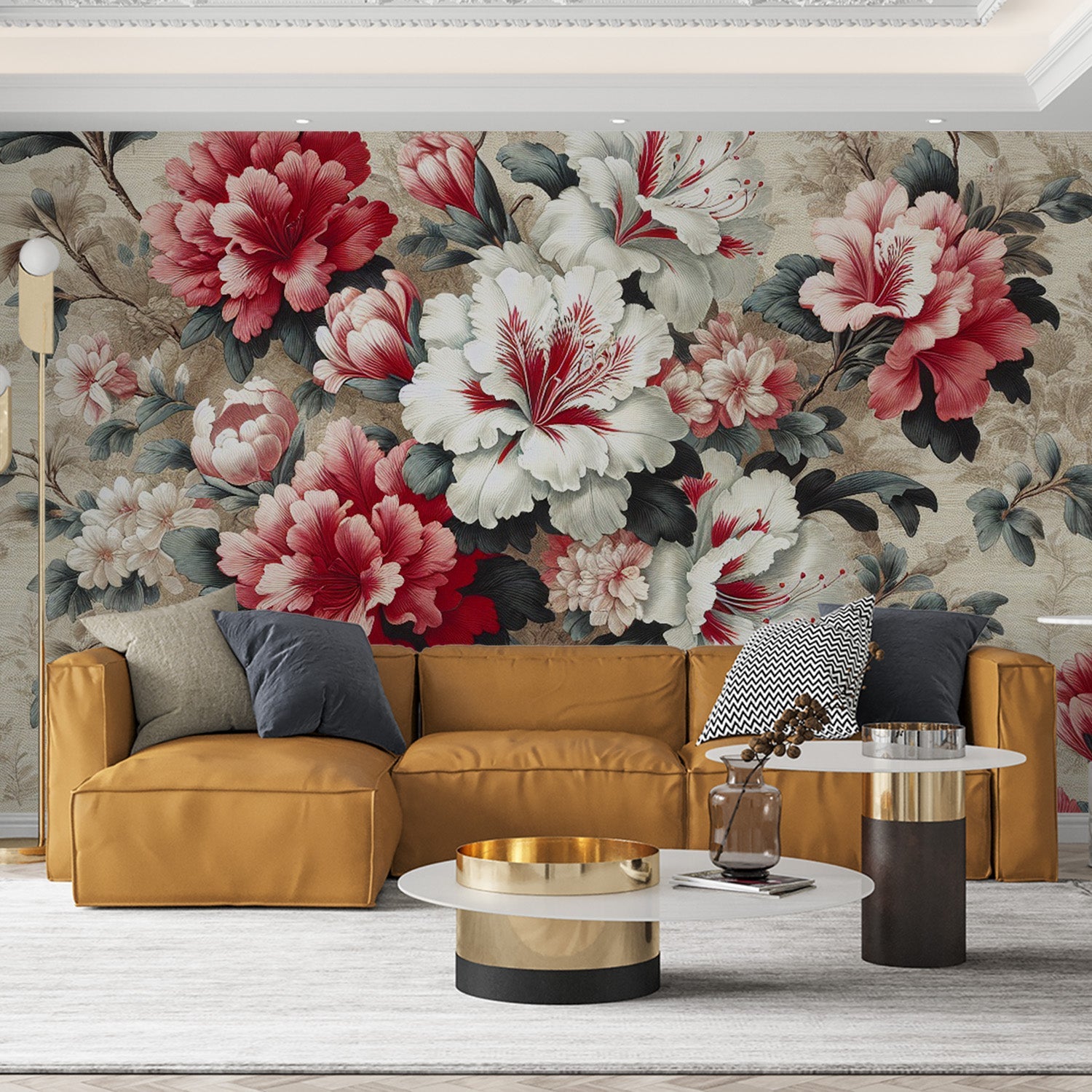Tapete Blumen | Rote und weiße Blumen auf altmodischer Tapete