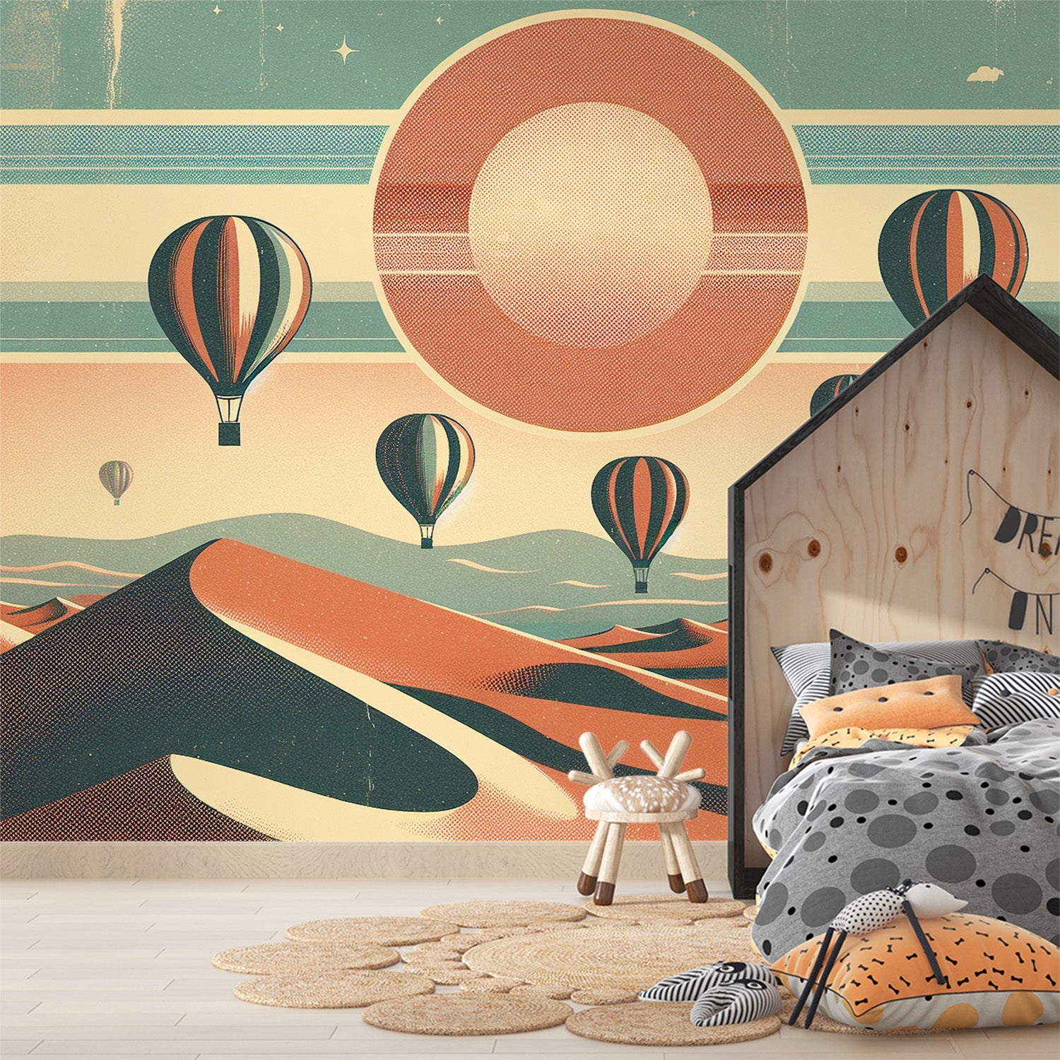 Erleben Sie die Ruhe eines Wüstenabends, ohne Ihr Zuhause verlassen zu müssen. Diese Kinder-Heißluftballon Tapete eignet sich perfekt für diejenigen, die eine Atmosphäre der Ruhe und des Entkommens in ihrem Zuhause schaffen möchten. Ideal für ein Kinderzimmer oder einen Ruhebereich, regt diese Baby-Heißluftballon Tapete die Fantasie an und lädt zur Ruhe und Entspannung ein.