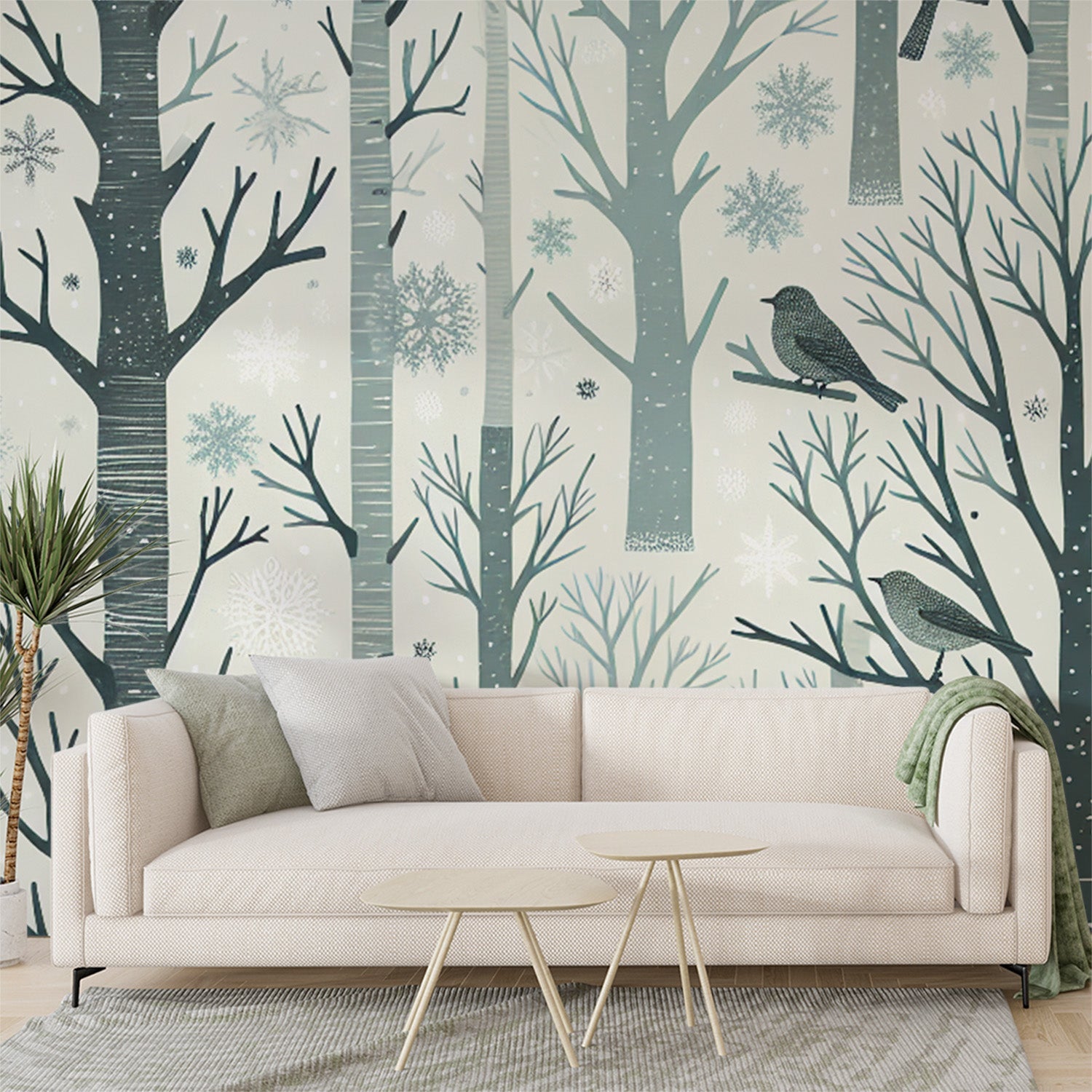 Dieses Vogel Tapete ruft die Ruhe einer winterlichen Landschaft hervor, in der stilisierte Bäume majestätisch auf einem Hintergrund aus zarten Schneeflocken stehen. Die Farbpalette, die sanfte Blau-, Grau- und Weißtöne mischt, schafft eine beruhigende Atmosphäre, perfekt für ein Zuhause, das Ruhe und Frische der Frosttage hervorrufen möchte.
